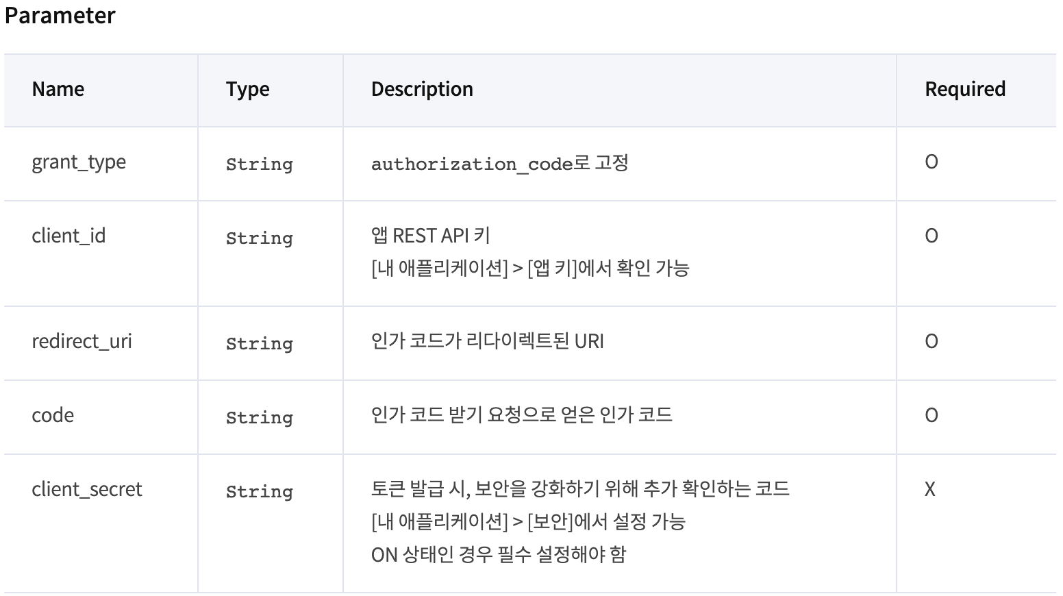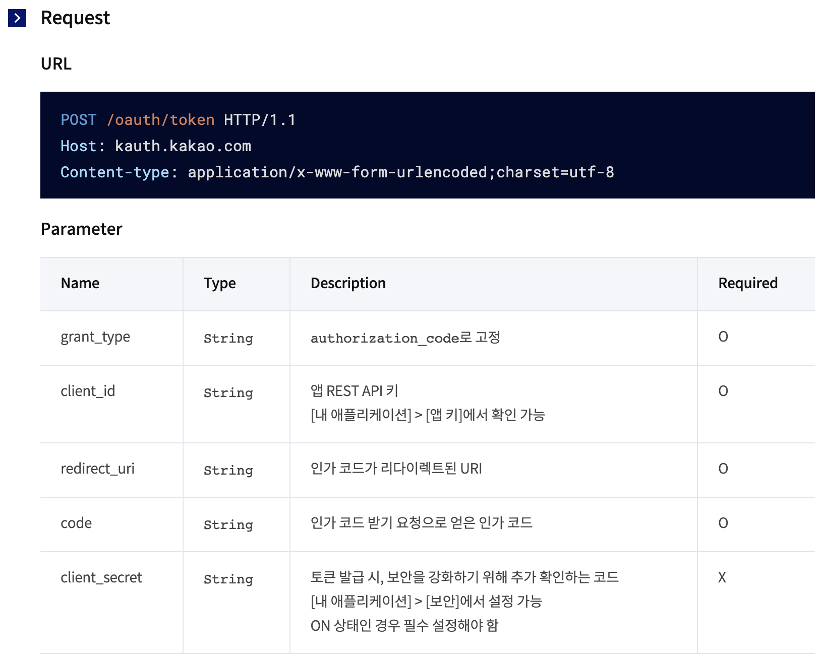 - 요청 URL은 [인가 코드 받기]에 있는 URL이다.