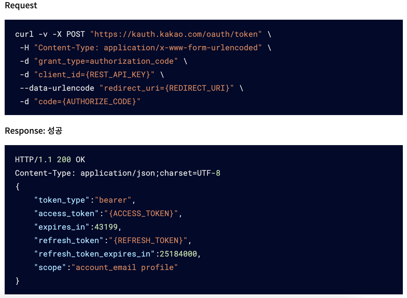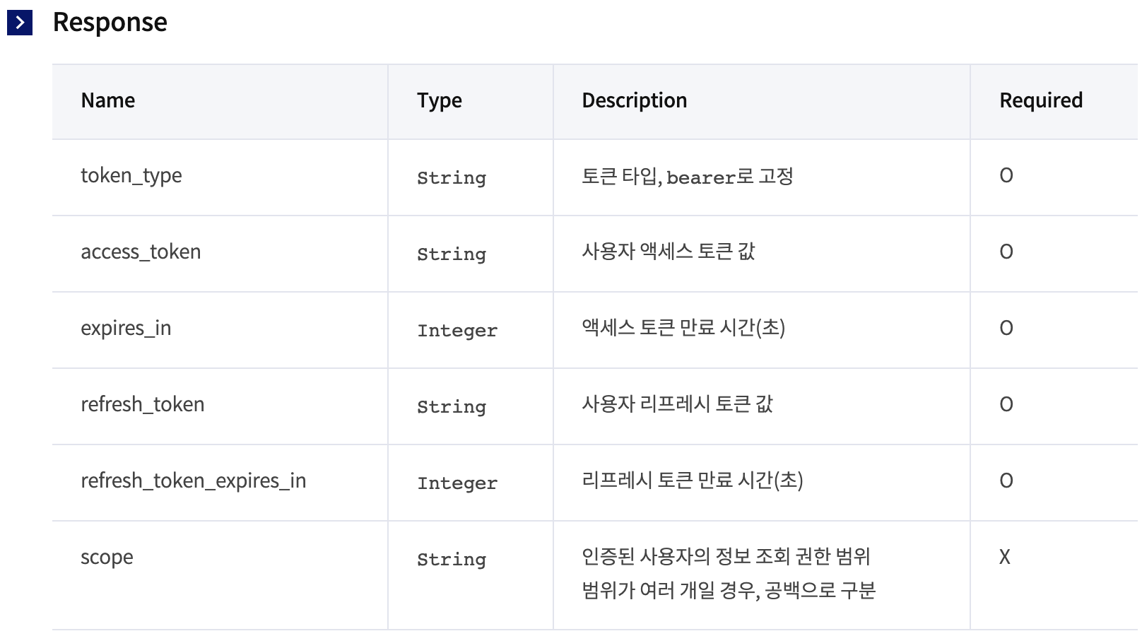 - [grant_type, 인가 코드, client_id, redirect_uri] 를 포함해서 카카오에 POST 요청해주면 카카오가 토큰을 돌려준다.