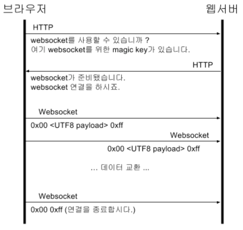 - TCP socket은 바이트 스트림을 사용하지만, WEB socket은 UTF-8의 텍스트와 바이너리 둘다 보낼 수 있다