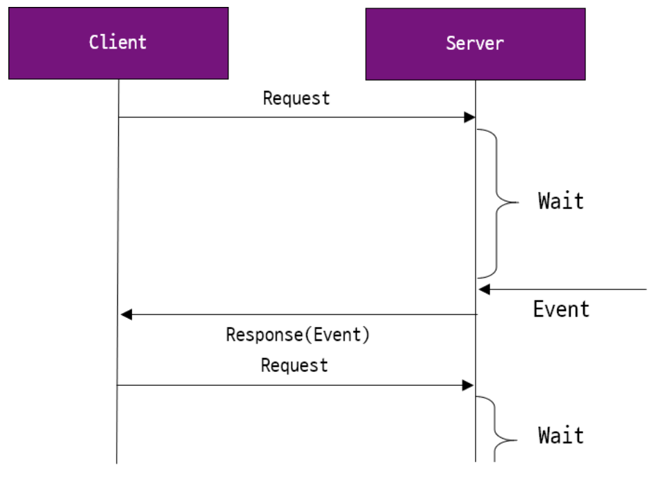 - HTTP 요청 시 서버는 해당 연결을 바로 해제하지 않고 일정시간 대기시킨다. 대기 시간 중 데이터가 업데이트(변경)가 일어났으면 바로 클라이언트에게 응답을 보내고 전달 받은 데이터를 처리한다. 응답을 받은 클라이언트는 바로 서버에 다시 요청을 보낸다