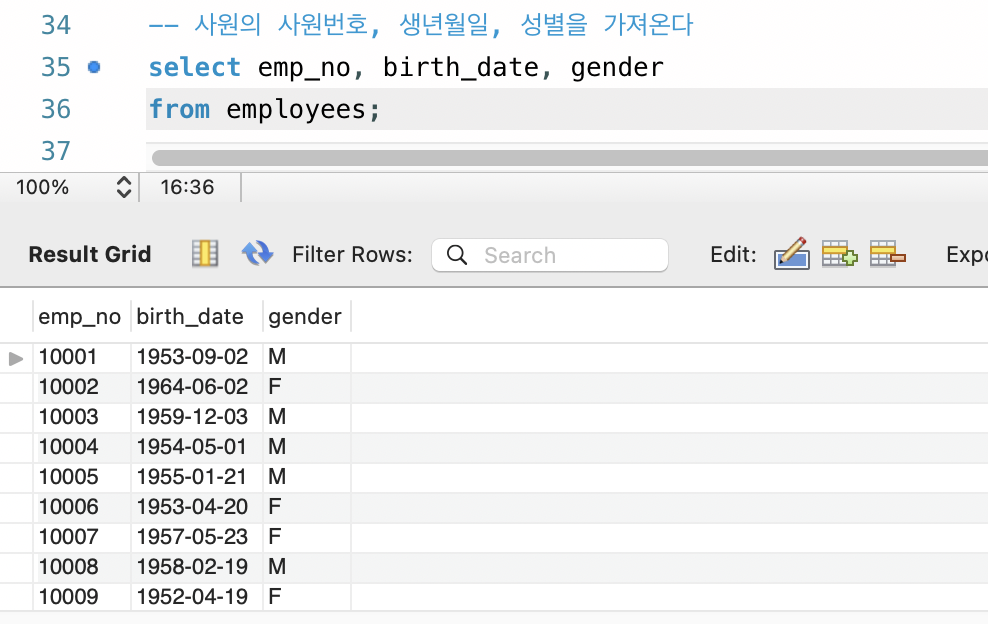 -- 사원의 사원번호, 생년월일, 성별을 가져온다