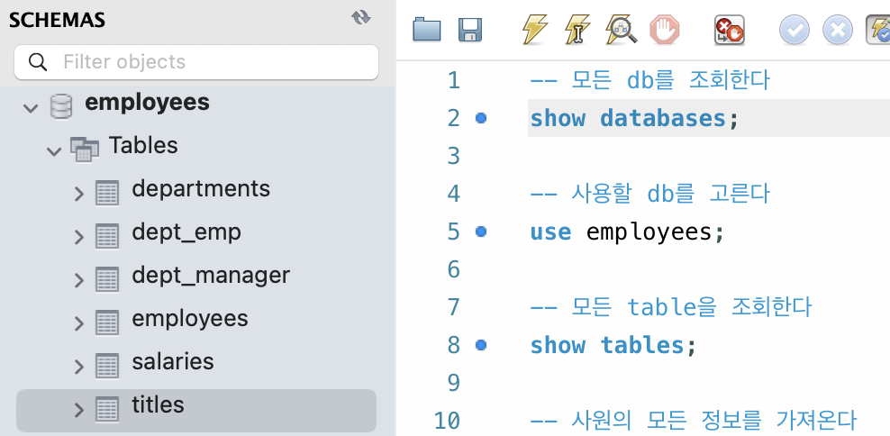 mysql -u root -p -t < employees.sql - 다운 받은 폴더에서 위 명령어를 치면 해당 db 정보가 로컬 mysql db에 추가된다