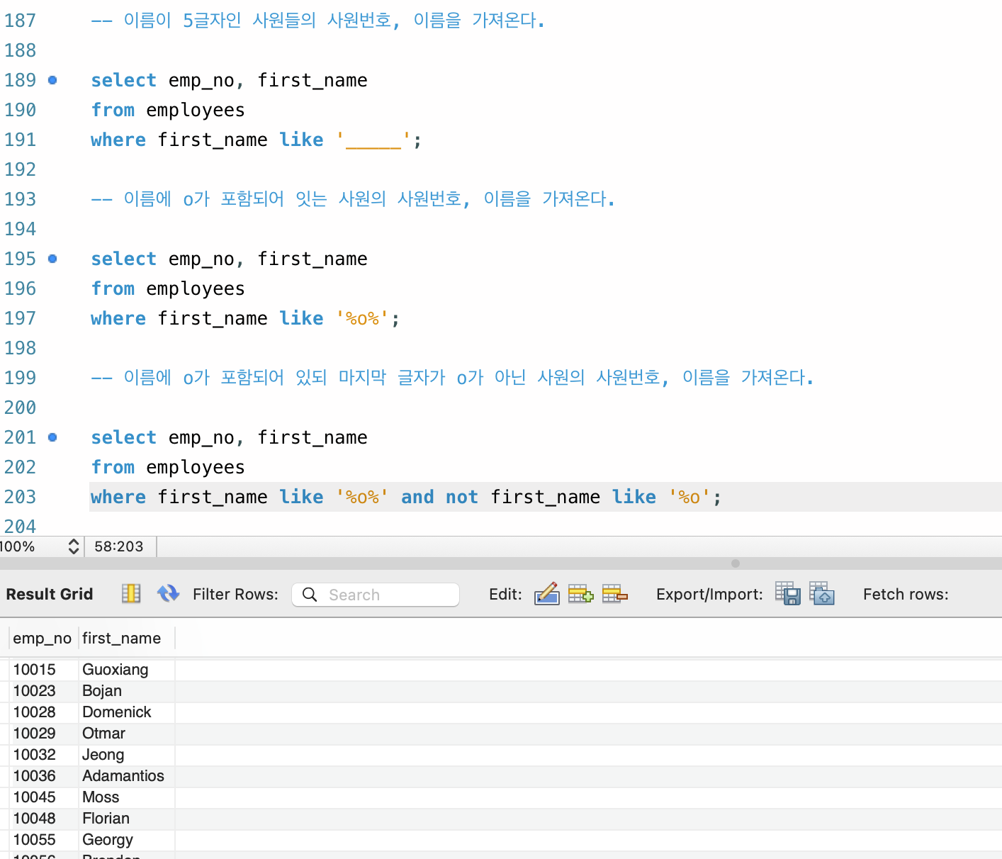-- 이름에 o가 포함되어 있되 마지막 글자가 o가 아닌 사원의 사원번호, 이름을 가져온다.