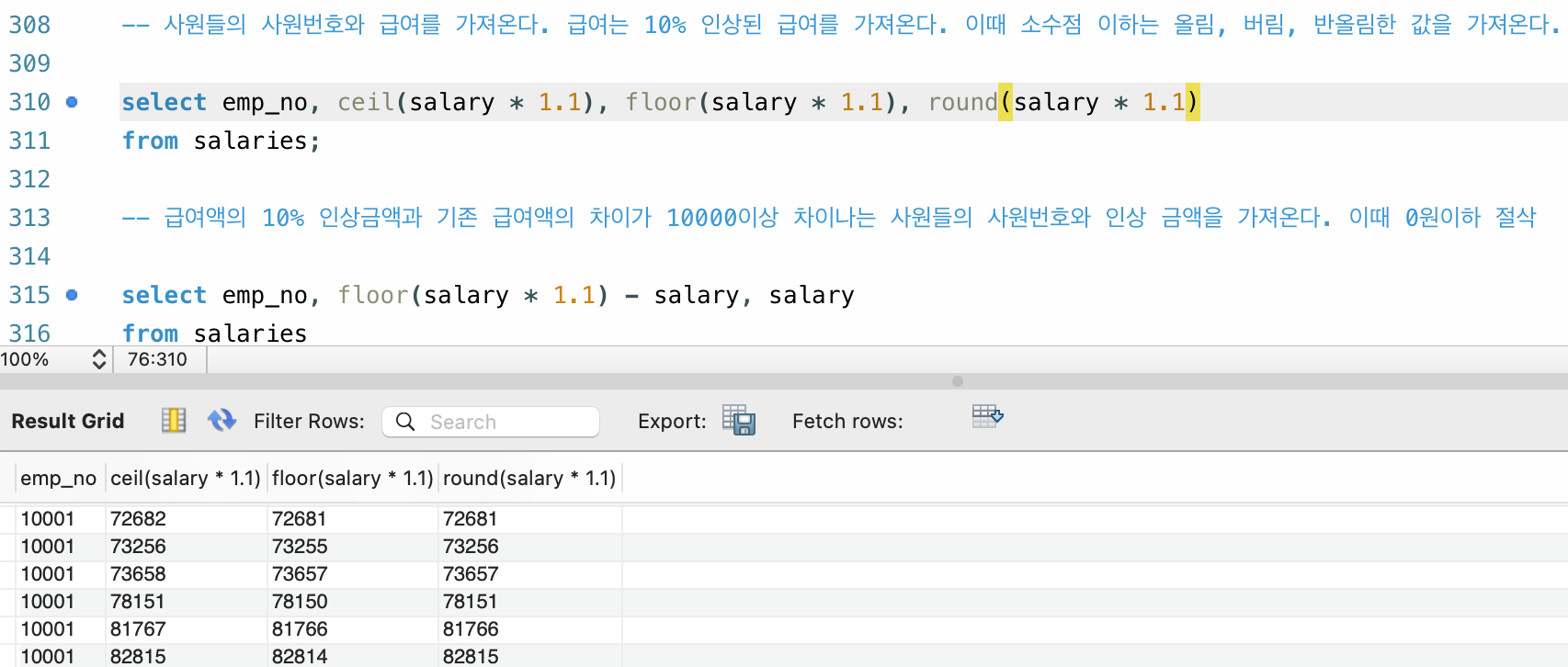 select emp_no, ceil(salary * 1.1), floor(salary * 1.1, 0), round(salary * 1.1)