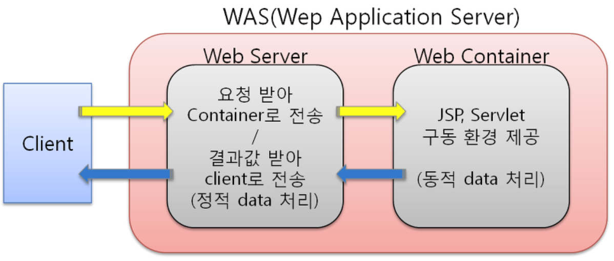 WAS : 웹서버의 역활 + 동적인 처리를 담당하는 서버이다.