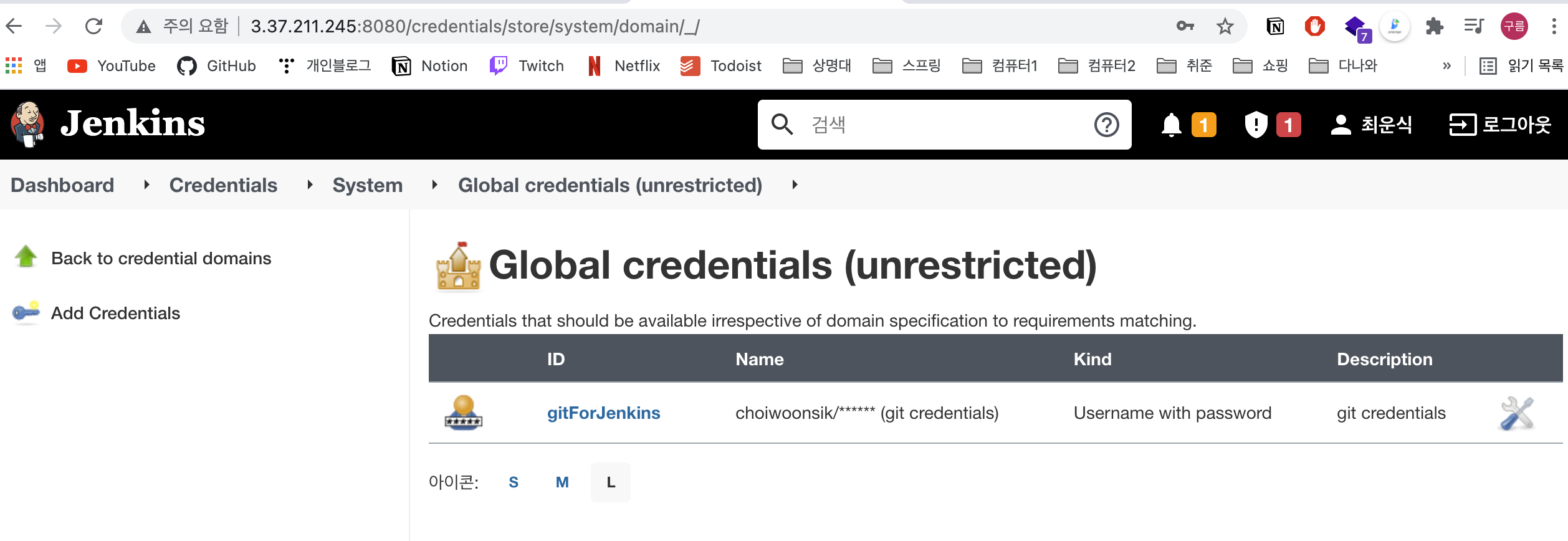 - Dashboard -> Jenkins관리 -> Manage Credentials -> jenkins -> Global credentials (unrestricted) 로 들어가서 git 관련 Credentials를 추가해준다