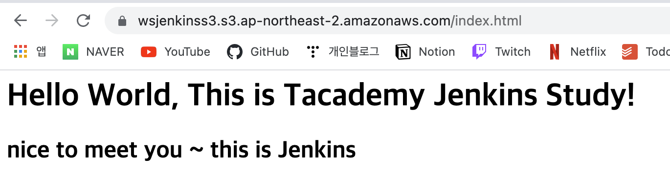 sh ```aws s3 sync ./ s3://wsjenkinss3``` - 현재 디렉토리를 s3://{나의 s3 주소}에 복사한다.