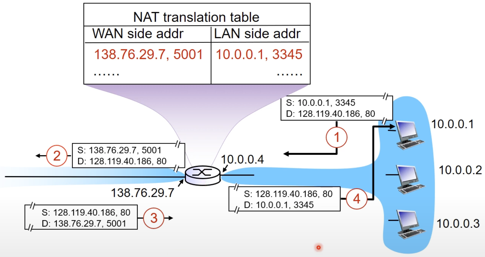 그렇다면 NAT은 어떻게 그룹 내 Host들을 구분할 수 있을까? 바로 포트번호를 통해 구별하게 된다. 내부 망에서 출발지 : [사설IP, port] 구조로 라우터에게 가게되고, 라우터는 translation table에 해당 출발지에 해당하는 포트번호를 매핑해서 [공인 IP, port]로 인터넷에서 요청이 간다. 응답이 오게 되면 포트번호를 NAT 테이블과 비교해서 맞는 사설 IP에 해당 응답을 전달해준다.
