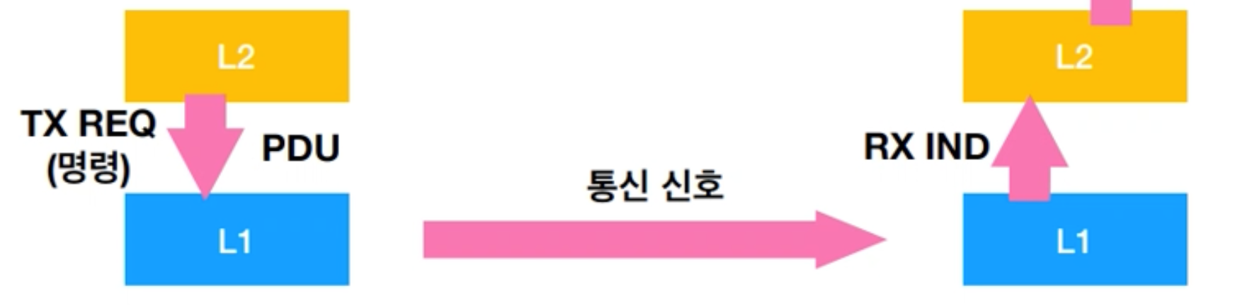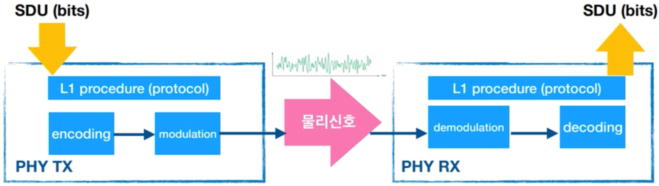 정보를 SDU로 받으면 인코딩 후 modulation을 통해 물리신호로 변경, 해당 신호를 받은 엔티티는 신호를 demodulation 한 후 디코딩을 한다