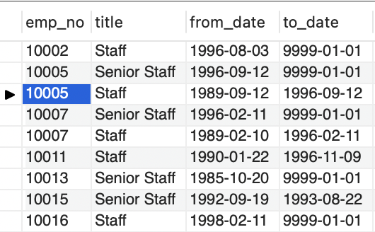 이력에 'Senior Staff' or 'Staff'가 있는 경우를 모두 가져온 경우