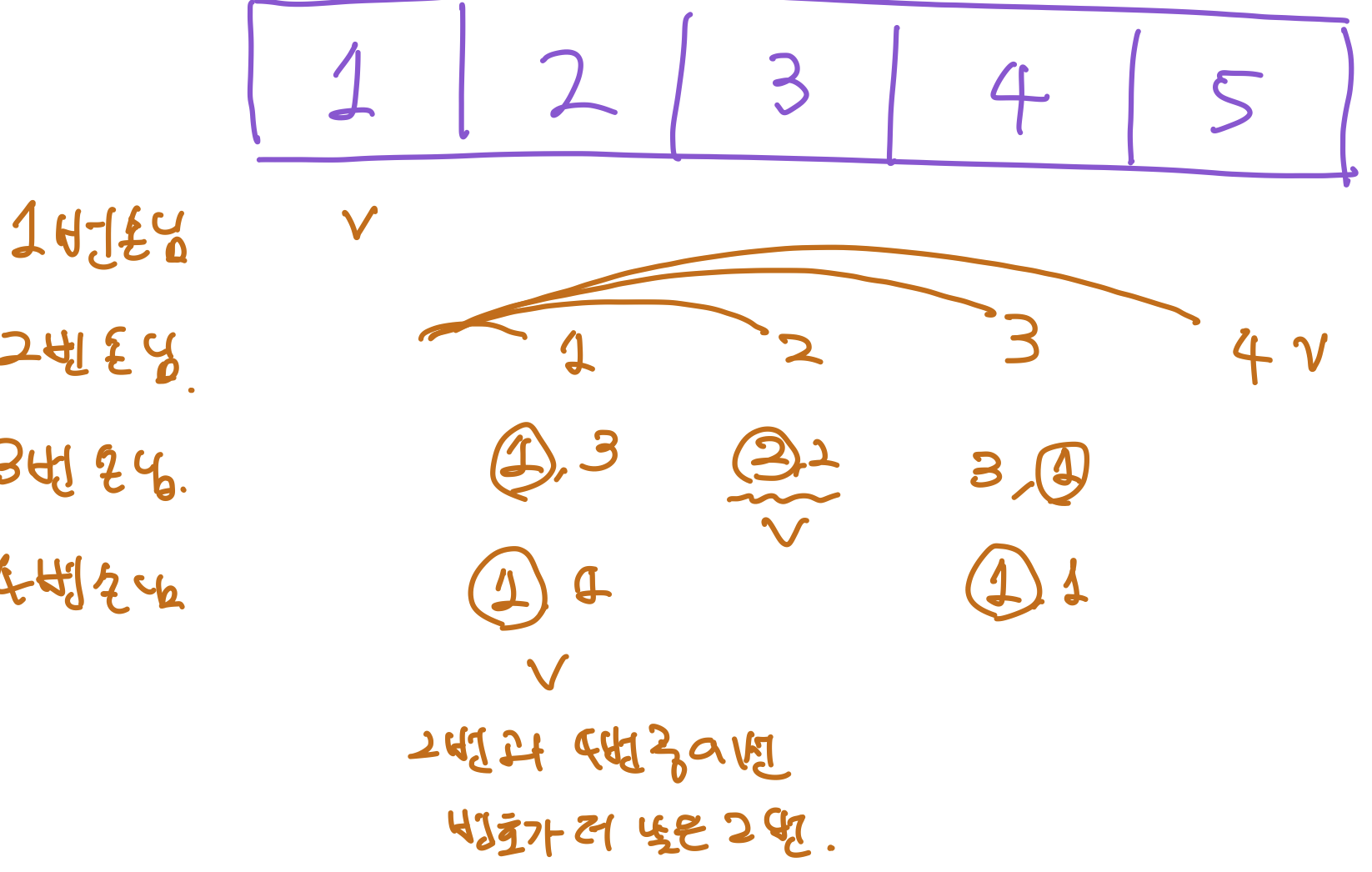 예들들어 1~5번 좌석에 대해서 5명이 순차적으로 앉게 되는 경우를 보면