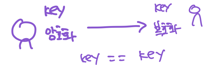 이때 하나를 비공개 키 (private Key), 나머지를 공개 키 (public Key)라고 지정한다. 비공개키는 자신만이 가지는 키이고, 공개키는 타인에게 제공하는 키이다.