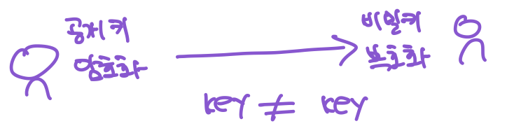 - 비밀키를 가지고 있는 사람이 자신의 정보를 암호화 한다.