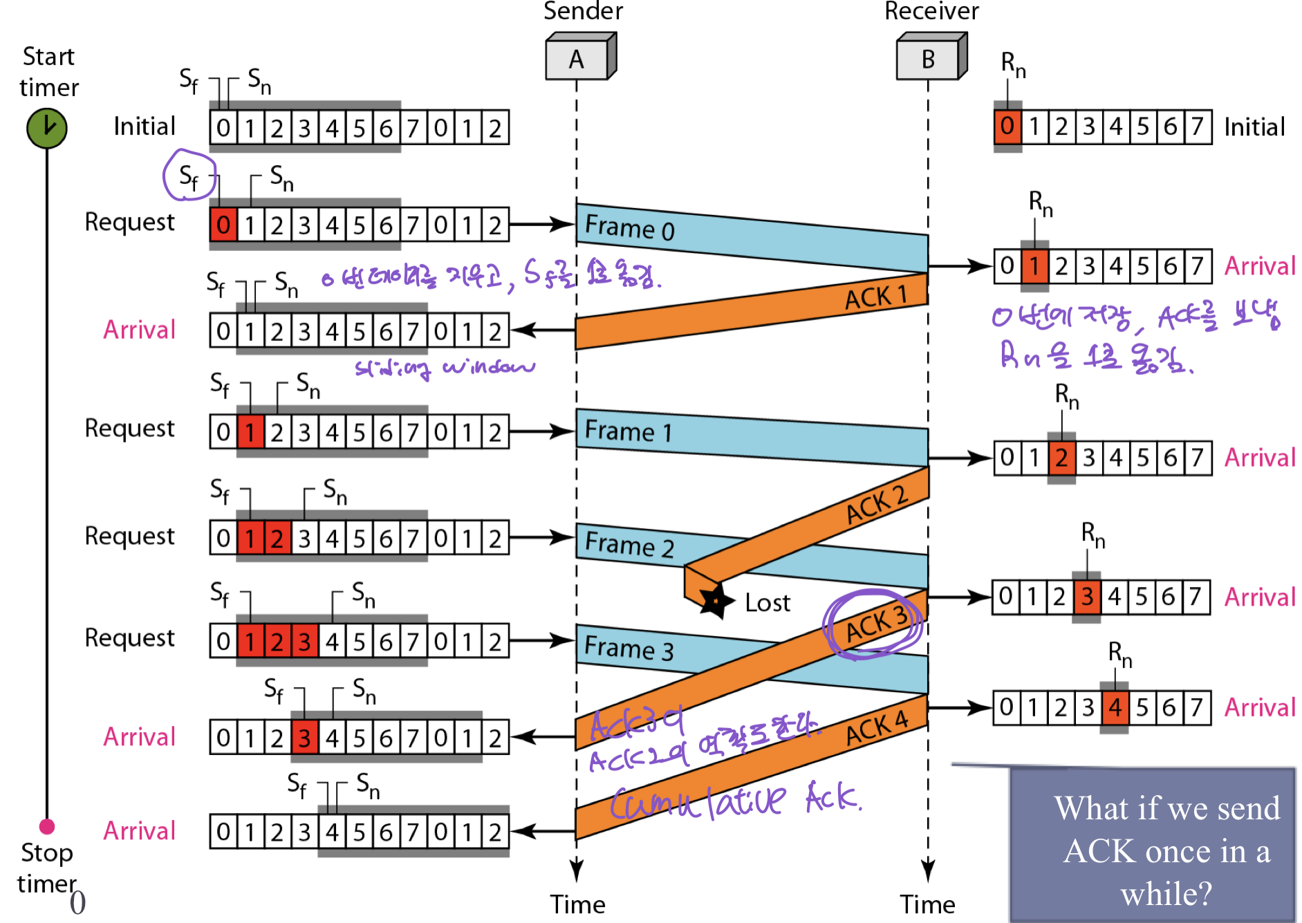 - ACK가 제대로 오지 않아도 다음 ACK가 제대로 오면 cumulative 방식으로 이전 프레임의 통신 여부를 판단한다.