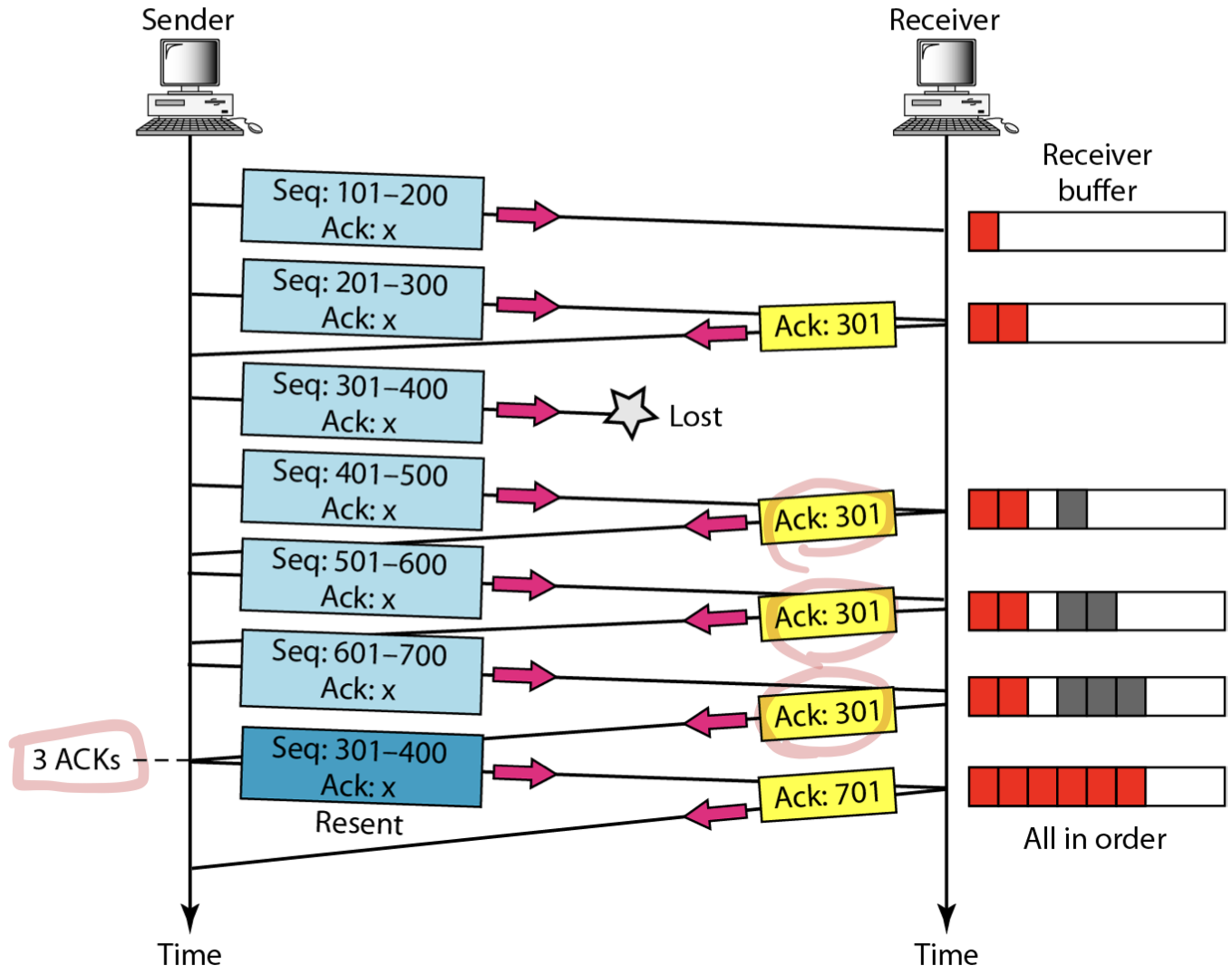 만약 동일한 부분에 대해 3번 ACK를 받으면 정말로 유실되었다고 판단하고 재전송하게 된다. - 즉 타이머 만료보다 빠르게 재전송 프레임을 판단하기 위한 방식이다. 단점으로는 모든 프레임마다 ACK를 보내야 한다는 점이다.