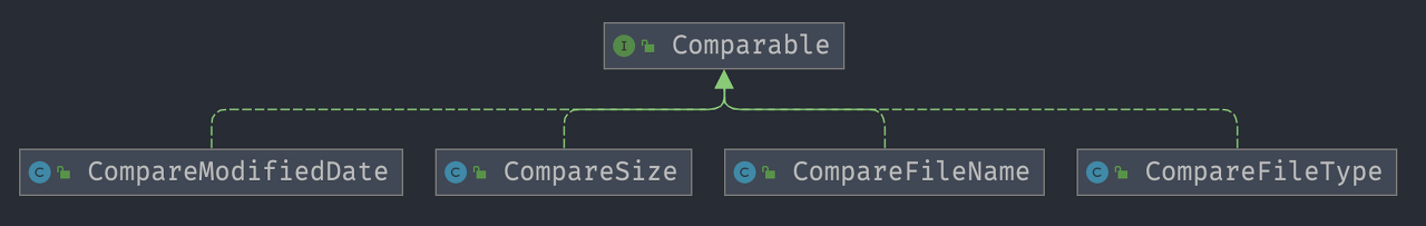 - CompareFileName, CompareFileType, CompareSize, CompareModifiedDate클래스들은 전부 Comparable 인터페이스를