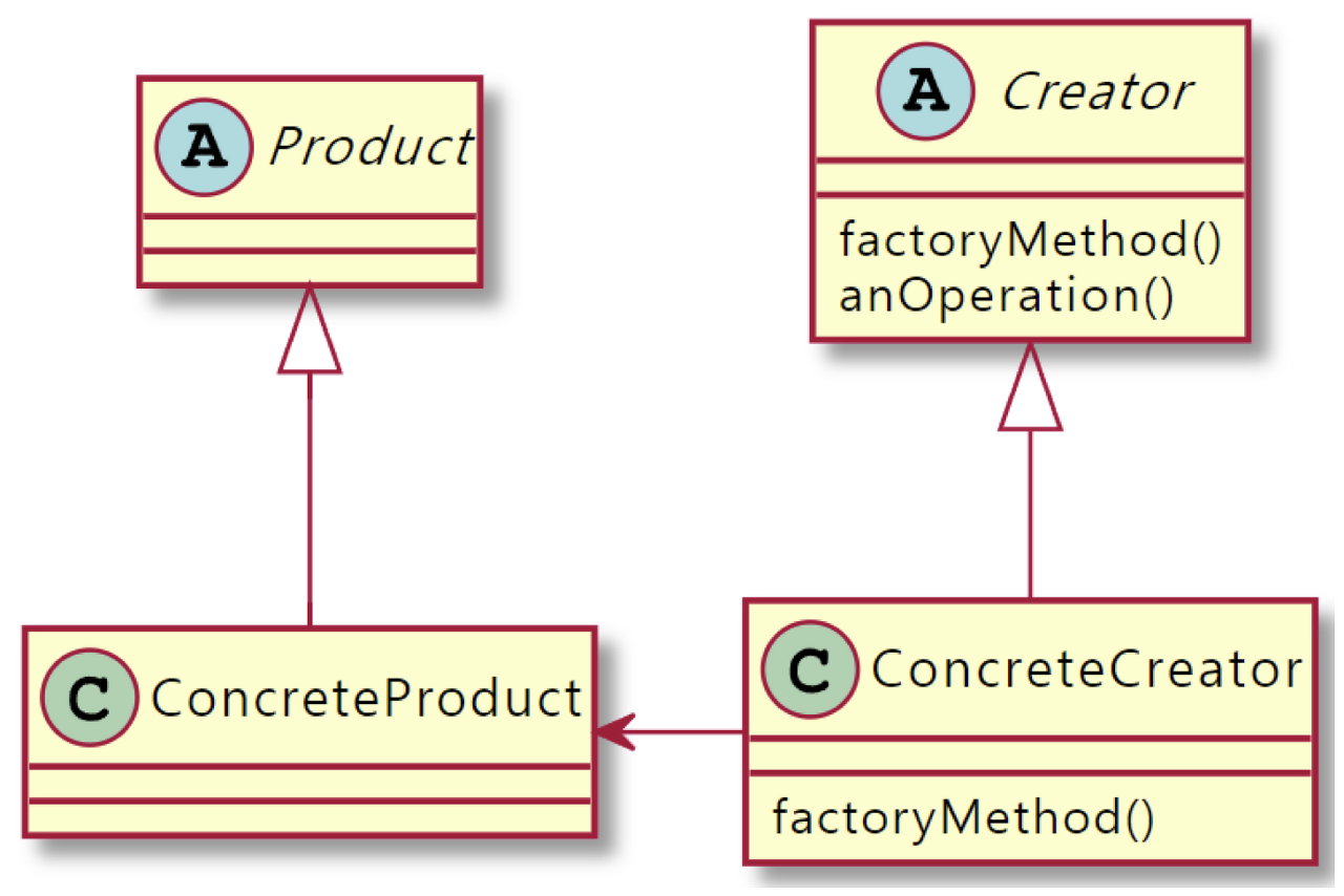- ConcreteCreator : 팩토리 메소드를 구현하는 클래스이다. 해당 클래스에서 ConcreteProduct 객체를 생성한다.