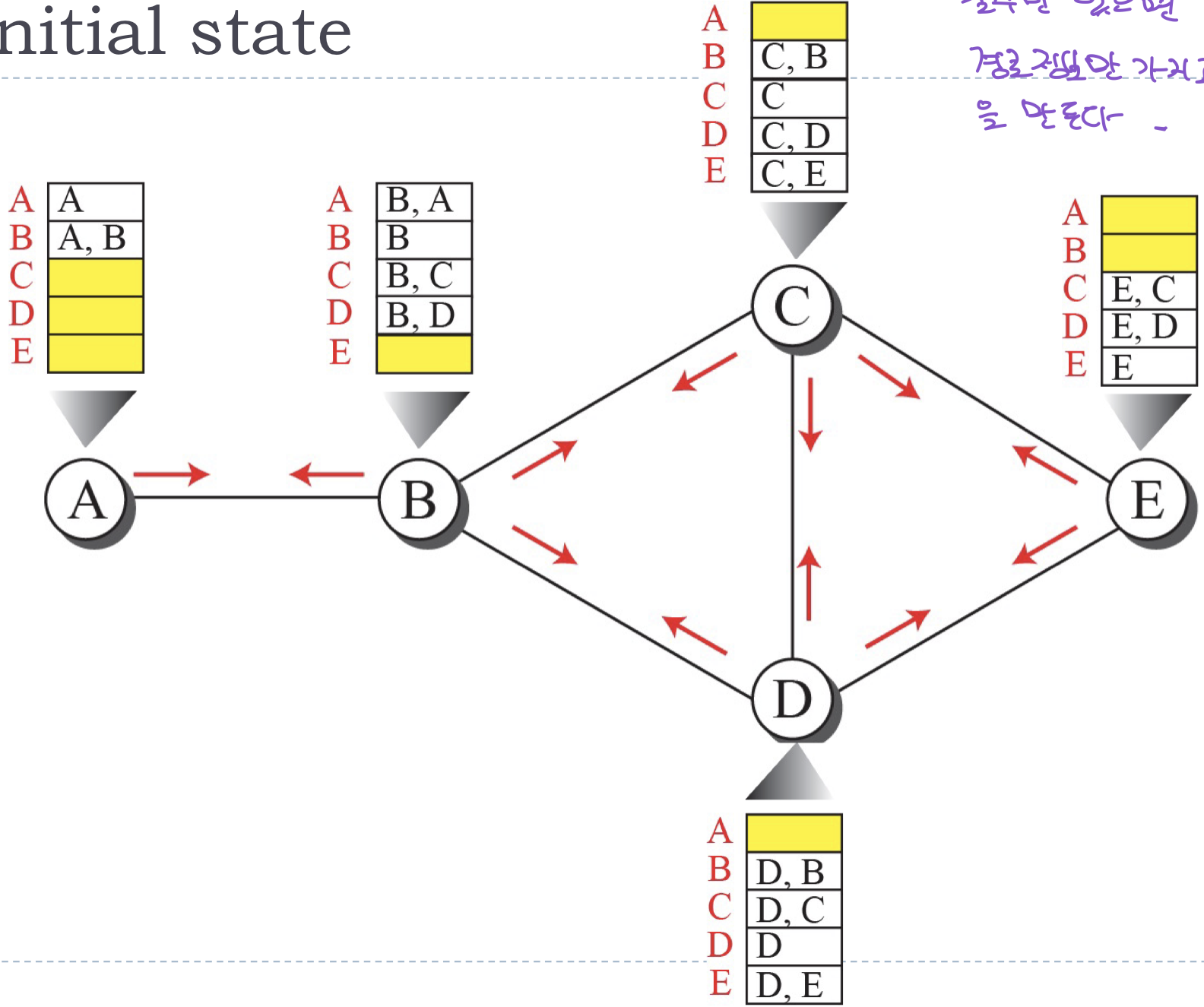 그림에서 보듯이 존재하는 경로에 대해서만 라우팅 테이블에 적시하게 된다. 후에 인접 노드들과 정보 교환 절차를 통해 더 나은 경로가 있다면 변경해주거나 추가해주게 된다.