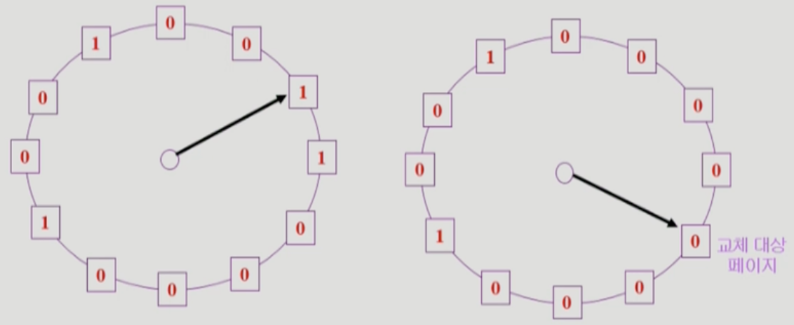 - Reference bit가 0인 것을 찾을 때까지 포인터를 한칸씩 이동한다. (참조되지 않은 page를 찾는 것으로 최대 한바퀴)