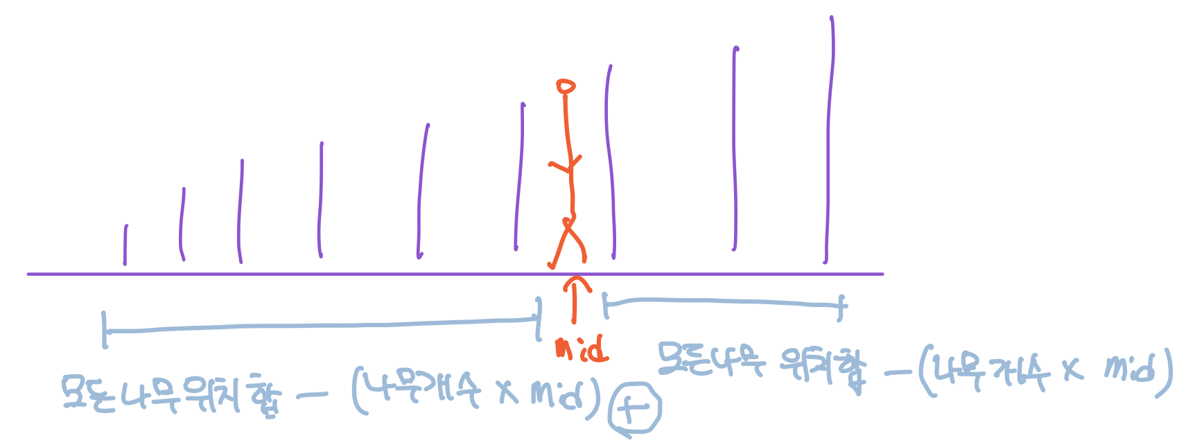 자신의 위치보다 mid 번째 나무가 작거나 같다면 해당 위치를 기준으로 (mid * 자신의 위치) - mid번 나무 누적합을 구해주고, 오른쪽은
