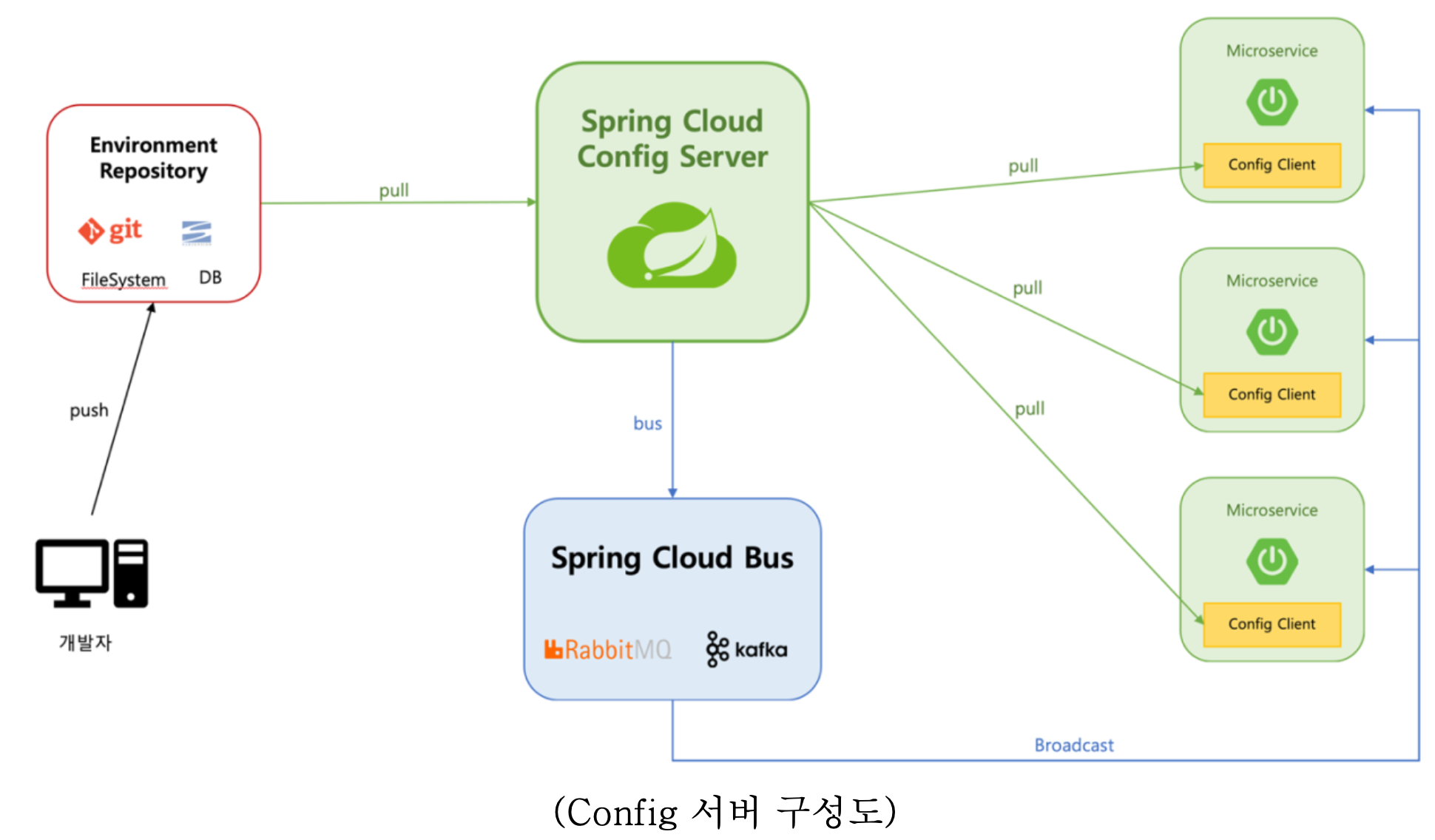 만약 서비스 운영 중에 설정파일을 변경해야 할 경우 Spring Cloud Bus를 이용하여 모든 마이크로서비스의 환경설정을 업데이트 할 수 있다. 스프링 클라우드 버스는 각 서비스들간의 실시간 메시지 통신 역활을 하는 RabbitMQ 또는 Kafka와 같은 경량 메시지 브로커들을 사용할 수 있도록 해주고, 이 메시지 브로커를 이용해서 각 서비스들에게 변경된 Config 설정정보를 전파하게 되는 것이다.