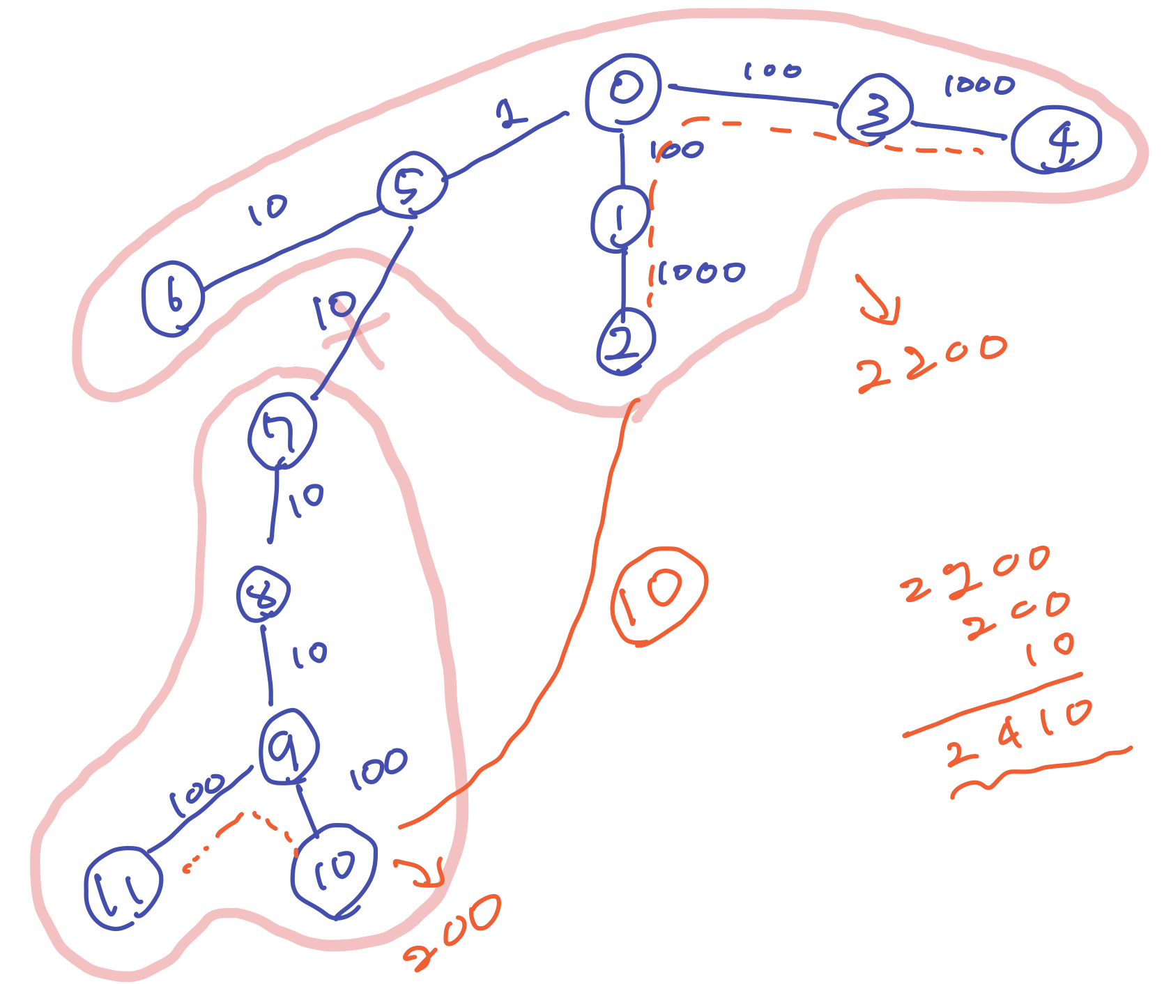 이런식으로 5-7 간선을 지웠을 때 2410으로 최대 지름을 갖게 된다.