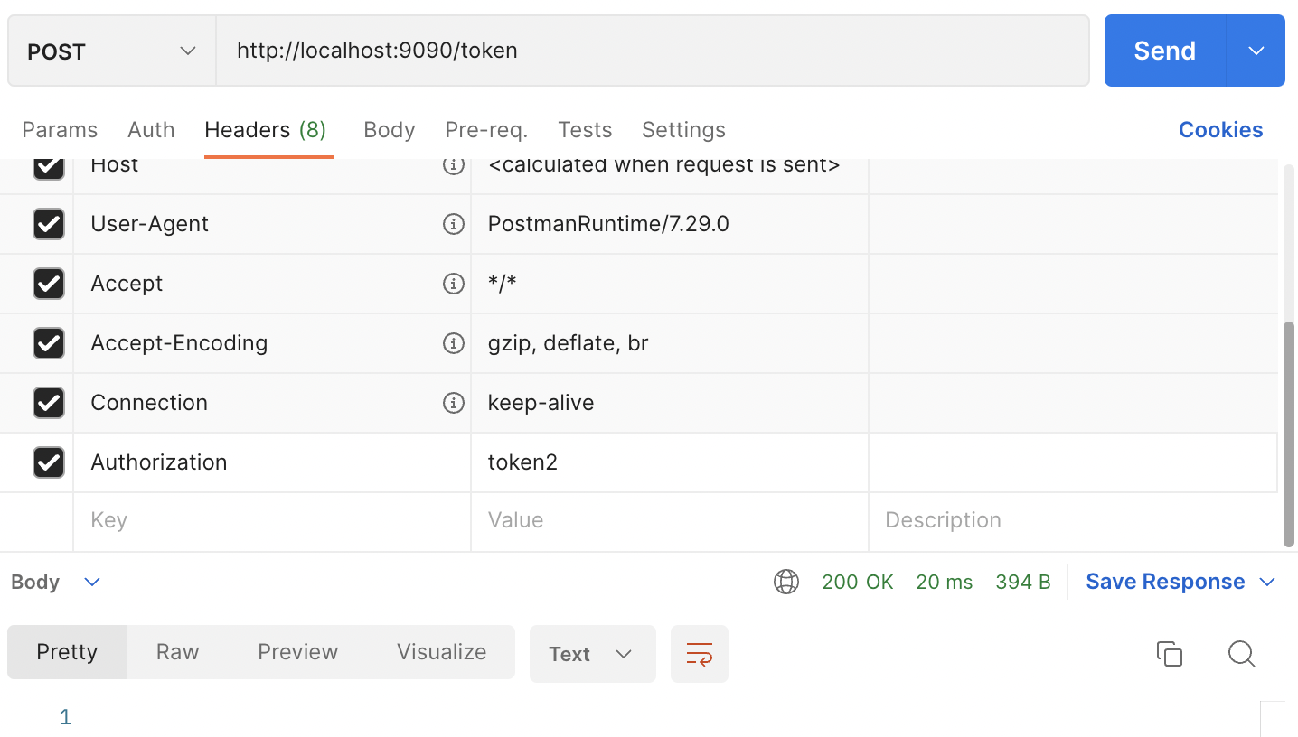 요청 시 Authorizaton에 "token2"를 넣어서 보내는 경우 (잘못된 토큰)