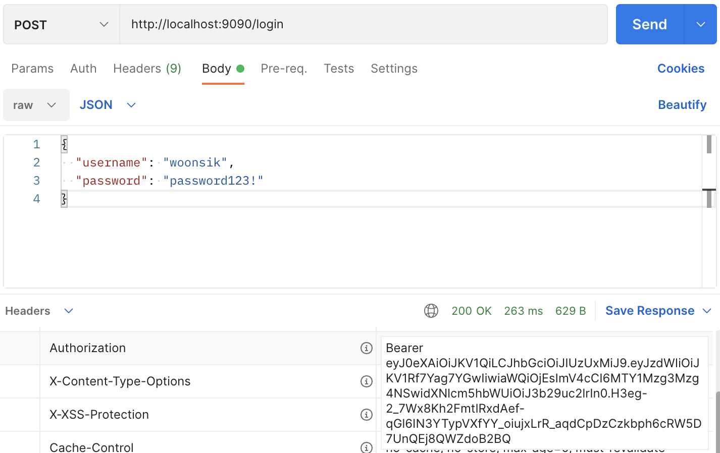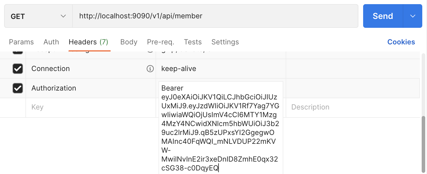 응답헤더에 HTTP Bearer 방식이므로 Authorizaiton : "Bearer _jwt_"를 추가한다. key-value 쌍으로 들어간다. (주의) Bearer 다음에 공백이 꼭 들어가야한다.