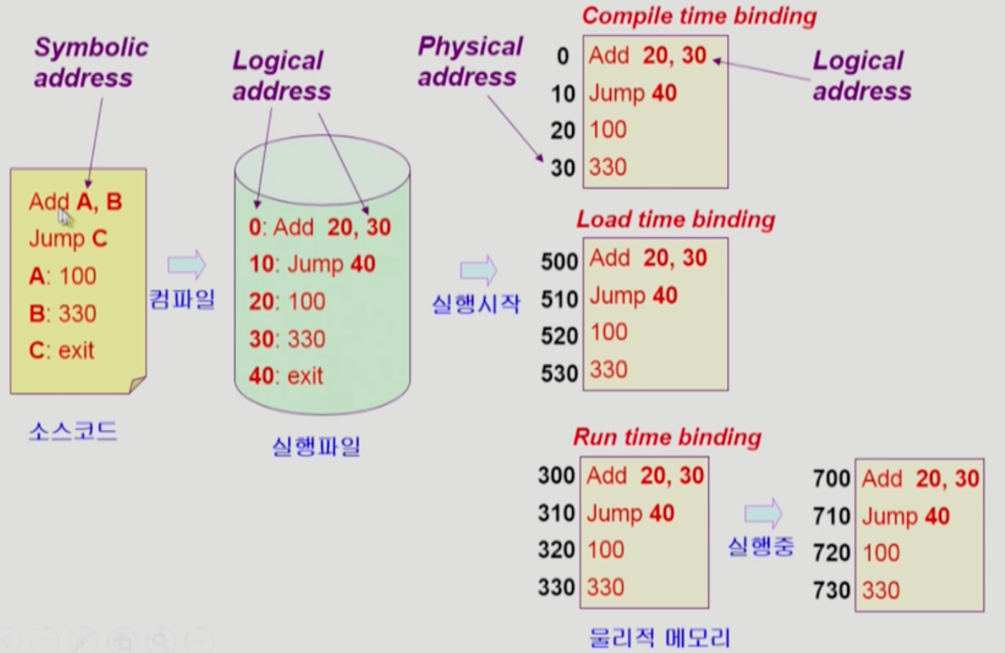 - 소스코드의 symbolic address가 컴파일이 되어서 실행파일에서 logical address로 변환된다.