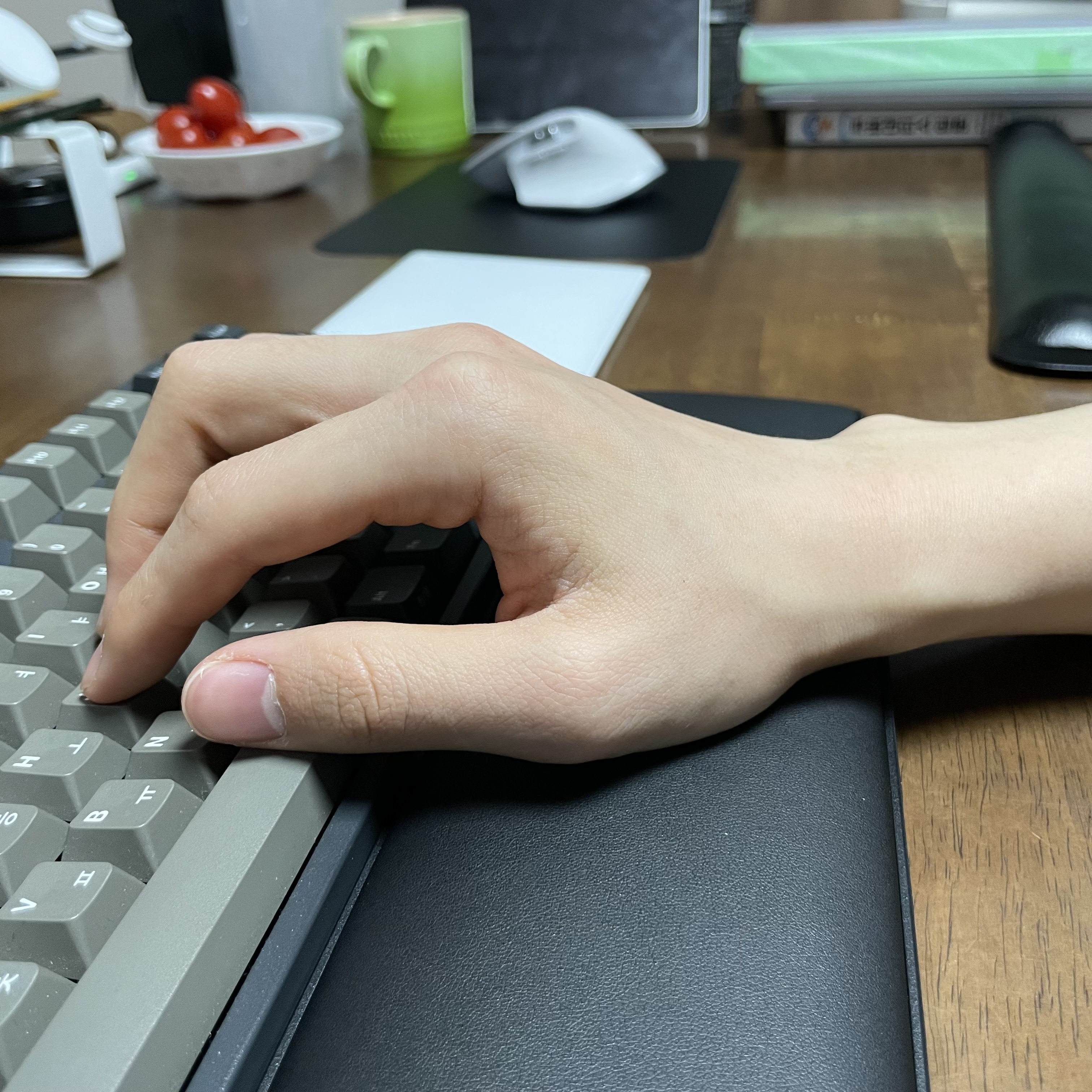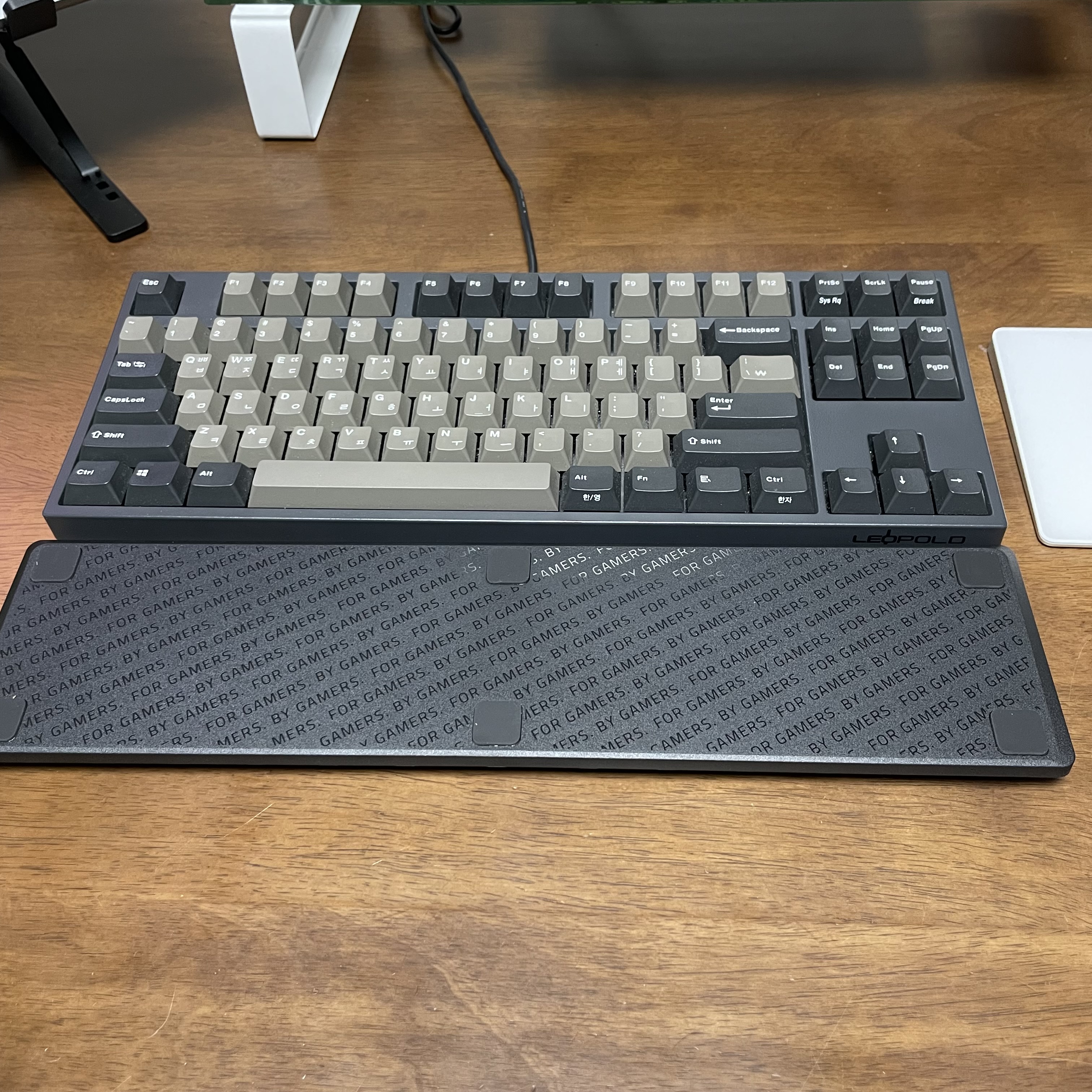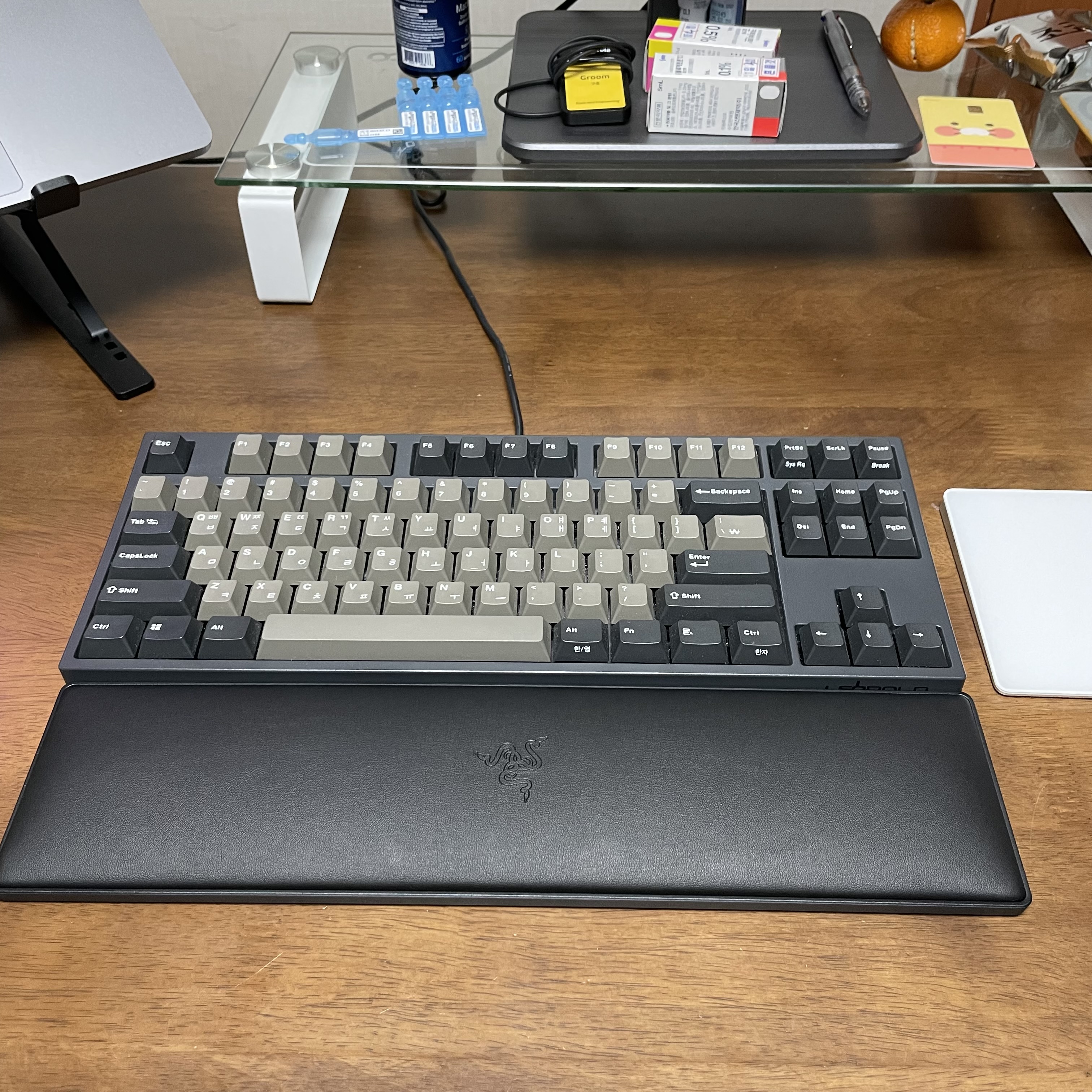요런식으로 TKL 제품이라 TKL 키보드에 길이가 딱맞는 모습이다. 폭신폭신하고 면적도 넓어서 손목을 올려놓으니 편안하니 좋았다.