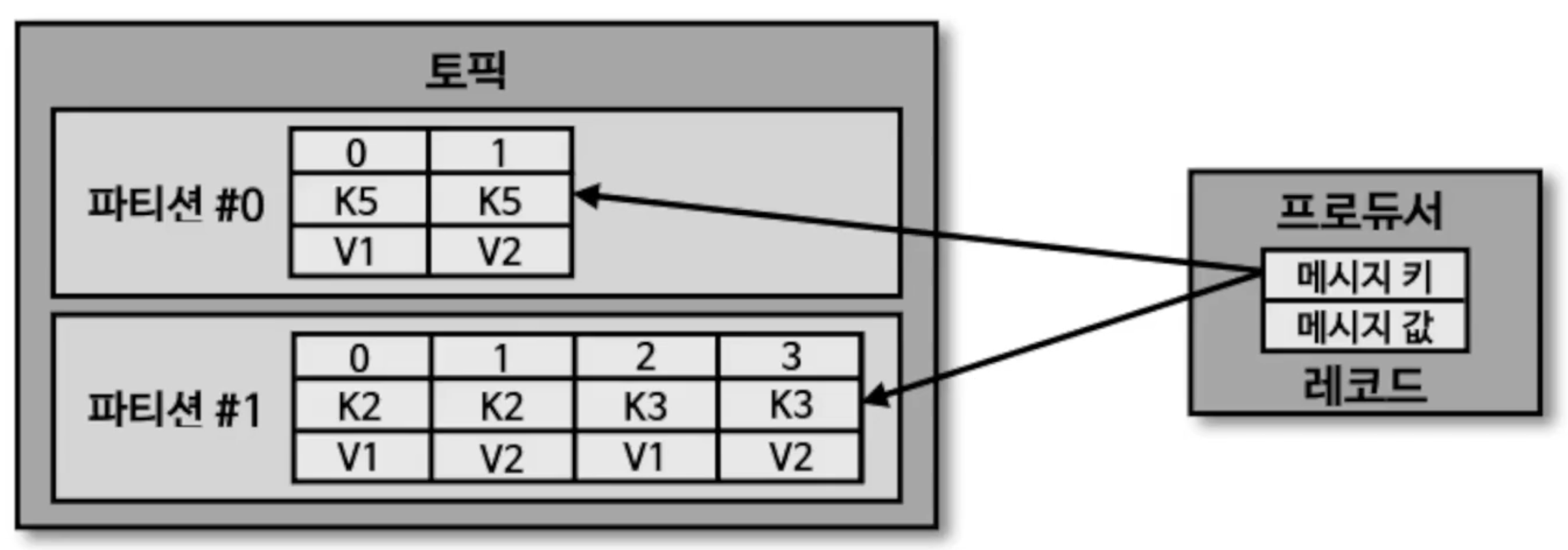 - 파티셔닝에 사용되는 메시지 키는 파티셔너(Partitioner)에 따라 토픽의 파티션 번호가 정해진다.