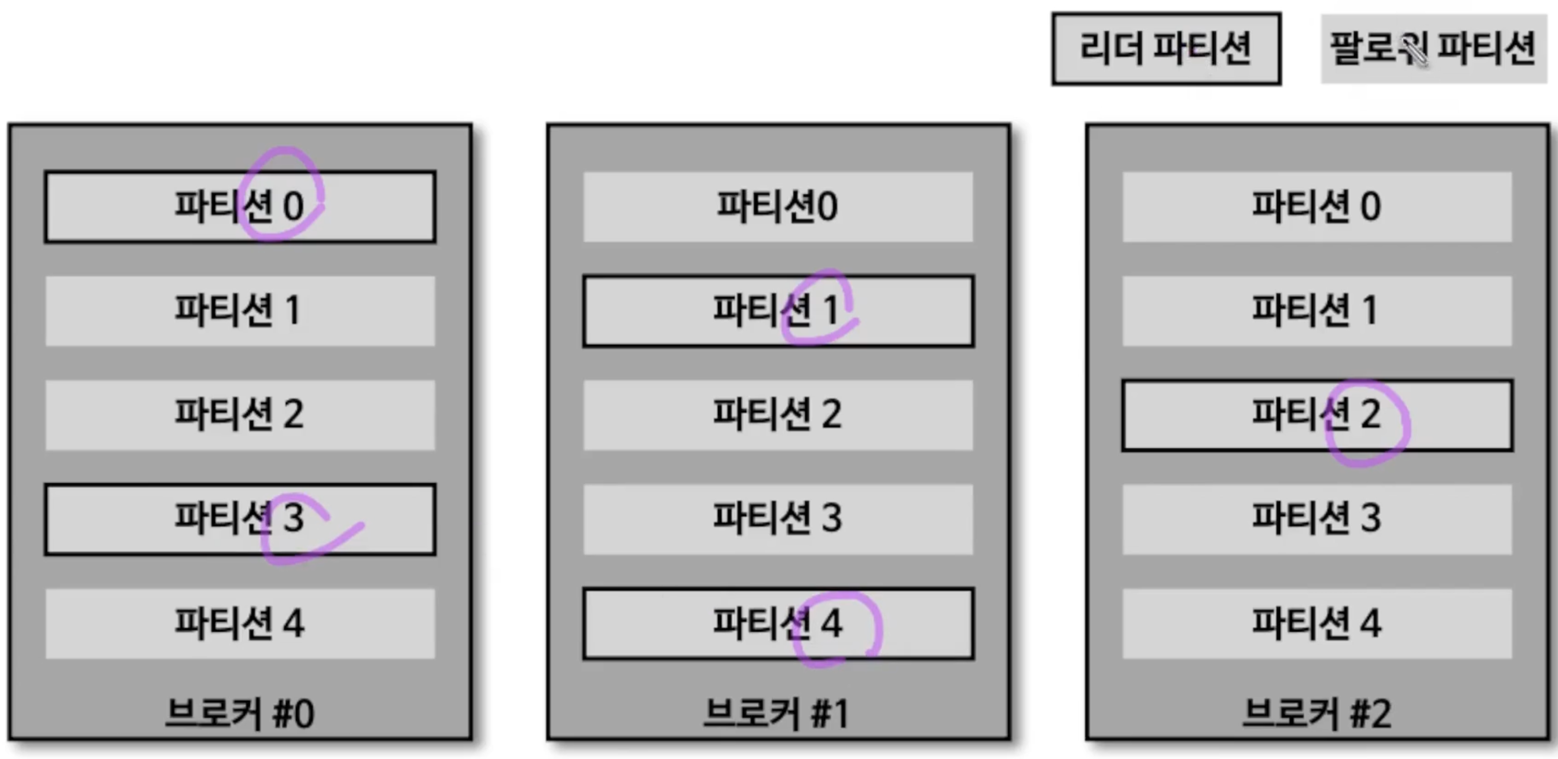 위 그림처럼 여러 브로커에 리더 파티션이 분포되게 된다.