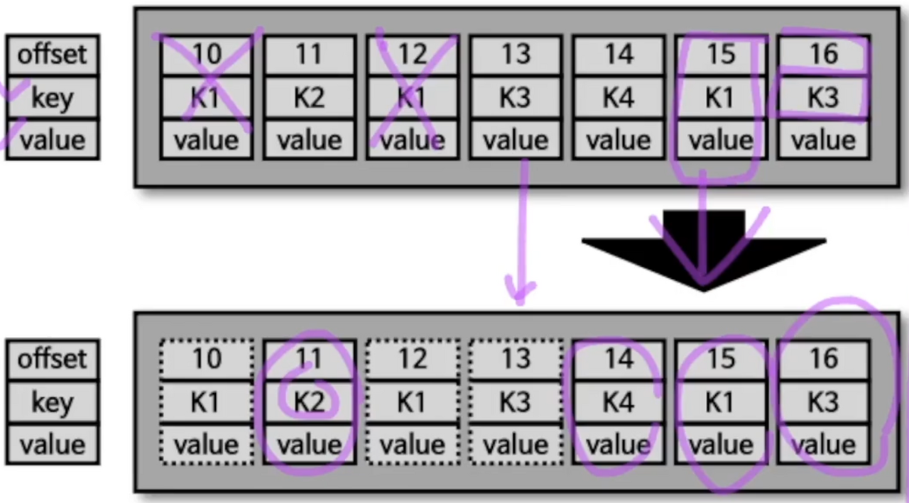(실상 압축이다) - K3 key를 갖는 offset 중 latest는 16번이므로 이외 offset은 모두 제거한다. (액티브를 제외한 전 세그먼트에 대해 이뤄진다)