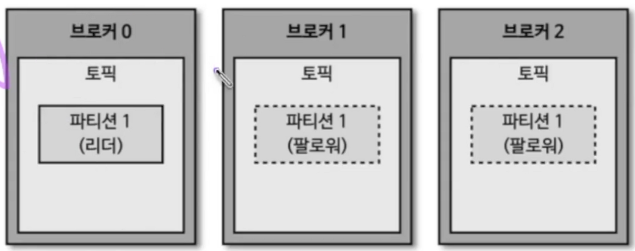 - 브로커는 하나의 서버에 하나씩 존재하며 일반적으로 클러스터 내 기본 3개이상 존재한다.