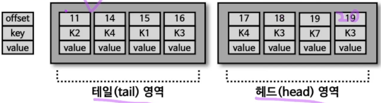 - compact가 아직 수행되지 않은 레코드들을 더티 로그라고 부르며, 이 세그먼트는 헤드 영역이 된다. 중복된 키가 존재한다
