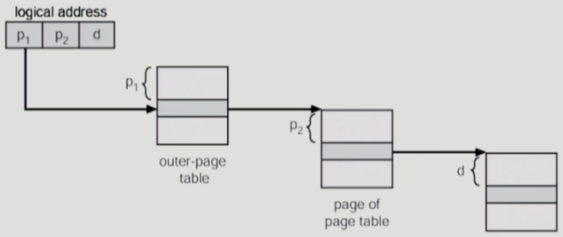 2) outer page table의 P1 위치의 page에서 두번째 테이블의 Page의 시작 주소를 구한다. P2의 오프셋으로 inner page table에 접근한다.