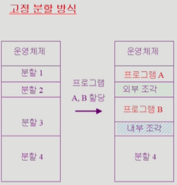 이러한 구조에 프로그램 A와 프로그램 B를 올리게 되면 프로그램 A는 분할 1, 프로그램 B는 분할 3에 할당이 되고, 분할 3은 프로그램 B를 넣고 남은 공간이 발생하는데 이 부분이 내부 조각이 된다.