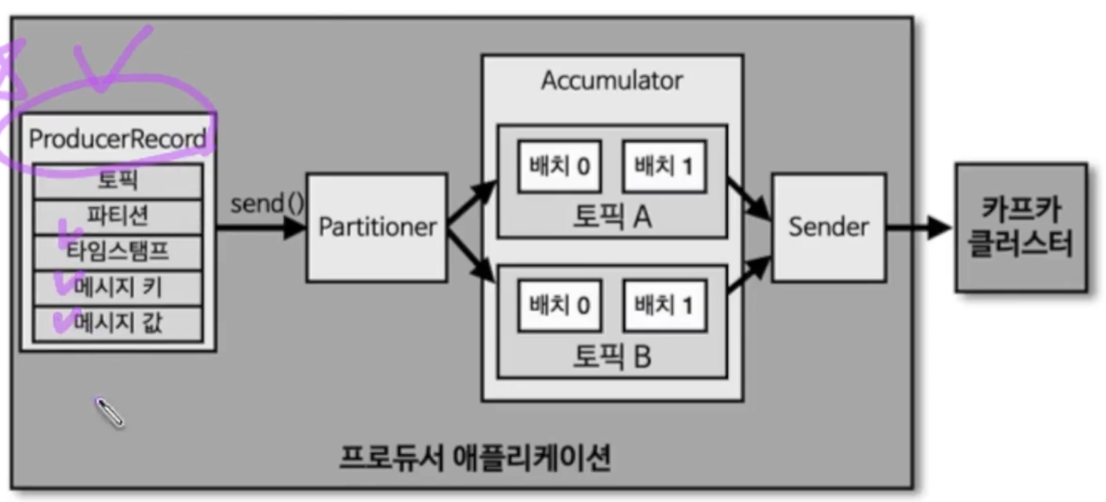 - 카프카에 필요한 데이터를 선언하고 브로커의 특정 토픽의 파티션에 전송한다.