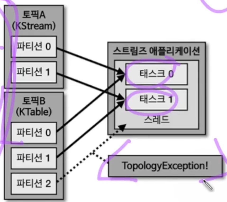 위와 같이 파티션의 수가 다르거나, 혹은 파티셔닝 전략이 다르다면 TopologyException이 발생하게 된다. 문제는 토픽들이 코파티셔닝 되어있음을 보장할 수 없다는데 있다. KStream과 KTable을 사용하는 2개의 토픽 A, B가 파티션 개수가 다를 수도 있고 파티션 전략이 다를 수도 있는 것이기 때문이다. 이런 경우 조인을 수행할 수 없고, 코파티셔닝 되지 않는 2개의 토픽을 조인하는 로직이 담긴 스트림즈 애플리케이션을 실행하면 TopologyException이 발생하게 된다.