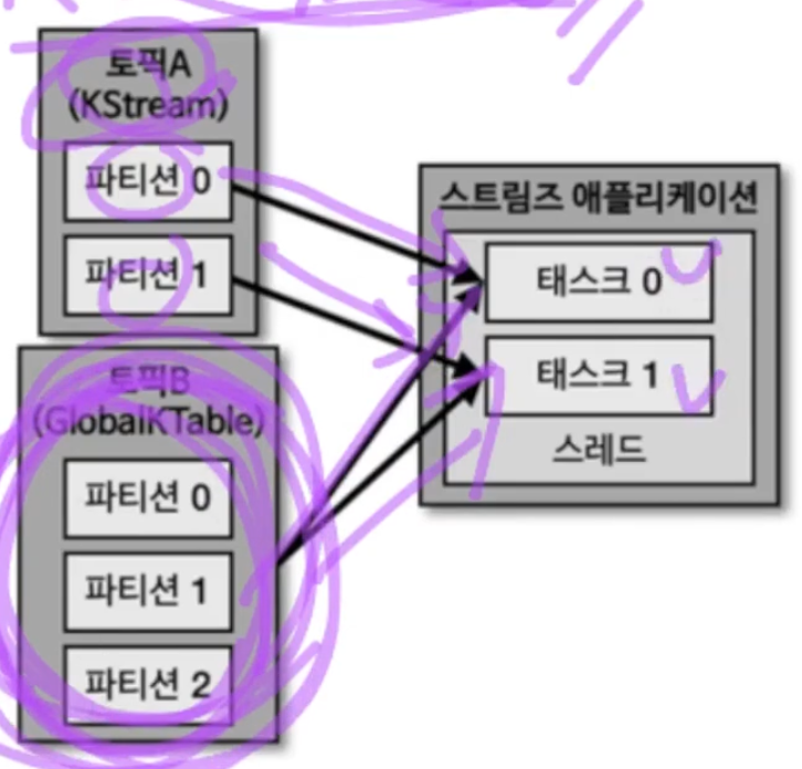 KTable의 경우 파티션의 수만큼 태스크가 일대일 대응되어 처리했지만 GlobalKTable의 경우 모든 파티션을 모든 태스크에 전달하여 처리하게 하므로서 코파티셔닝 되지 않더라도 TopologyException이 발생하지 않게 된다.