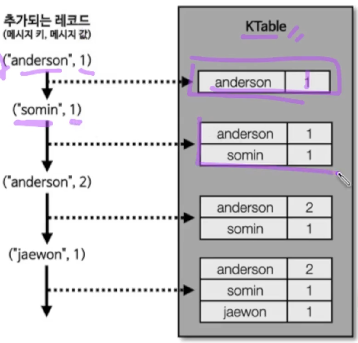 - KStream은 토픽의 모든 레코드를 조회할 수 있지만, KTable은 unique한 메시지 키를 기준으로 latest 레코드를 사용하게 된다.