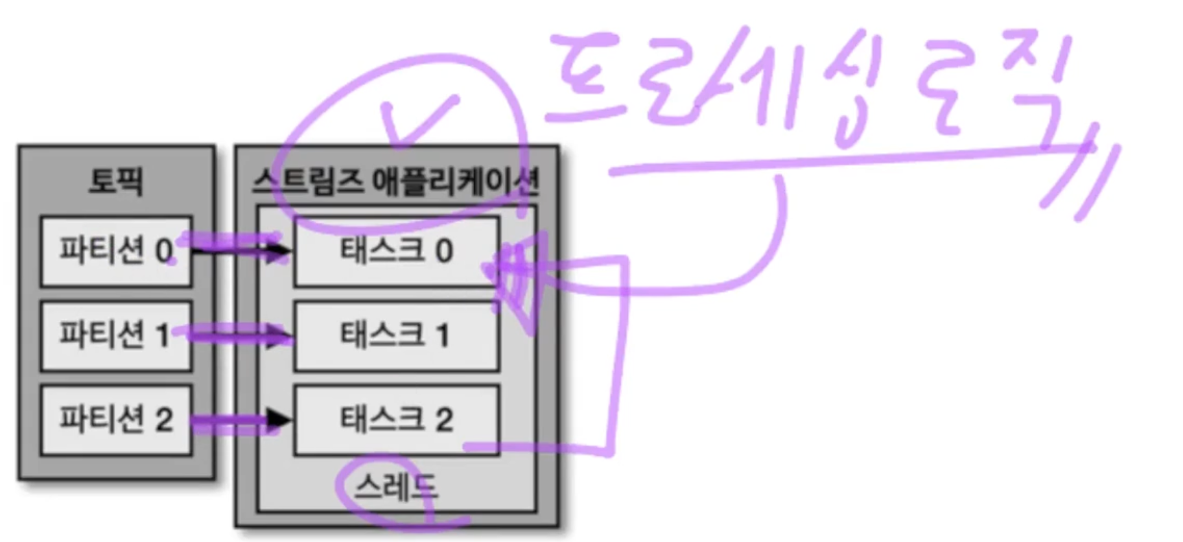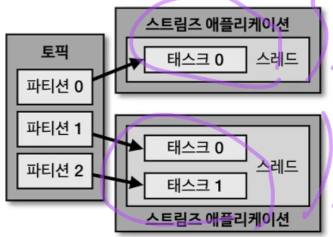 스트림즈 애플리케이션은 내부적으로 스레드를 1개 이상 생성할 수 있으며, 스레드는 1개 이상의 태스크를 갖는다. 스트림즈의 태스크는 스트림즈 애플리케이션을 실행하면 생기는 데이터 처리 최소 단위이다. 만약 3개의 파티션을 가진 토픽을 처리하는 스트림즈 앱이 실행된다면 3개의 태스크가 생기게 되는 것이다.