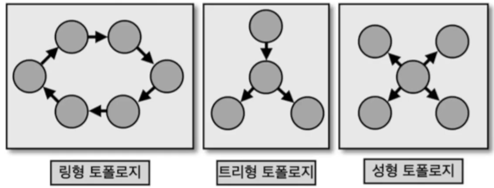 카프카 스트림즈의 구조와 사용방법을 알기 위해서는 토폴로지와 관련된 개념을 먼저 알아야 한다. 토폴리지는 2개 이상의 노드들과 선으로 이뤄진 집합을 뜻한다. 종류로 ring, tree, star 형이 존재하며 카프카 스트림즈에서 사용하는 토폴로지 경우 tree 형태와 유사하다.