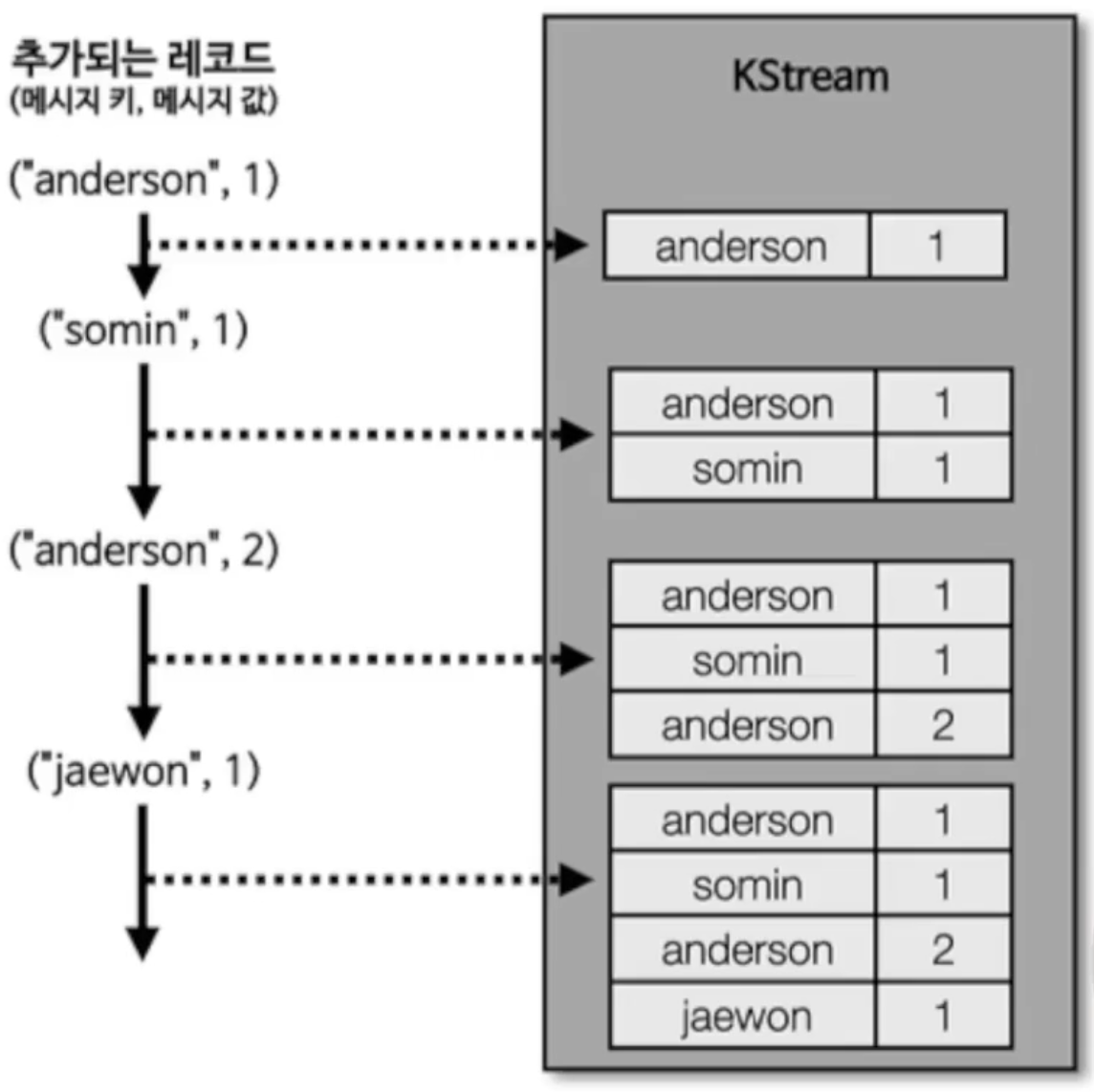 - 레코드는 하나씩, 들어오는대로 하나씩 키값 쌍으로 처리하게 된다.