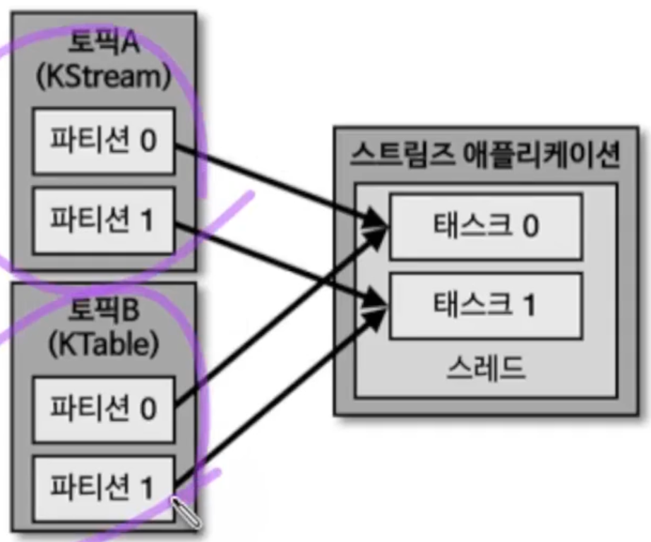 파티션 개수가 동일하고 전략도 동일하다면 동일한 메시지 키를 가진 데이터가 동일한 태스크에 들어가는것을 보장하게 된다. 이를 통해 각 태스크는 KStream의 레코드와 KTable의 메시지 키가 동일한 경우 조인을 수행할 수 있다.