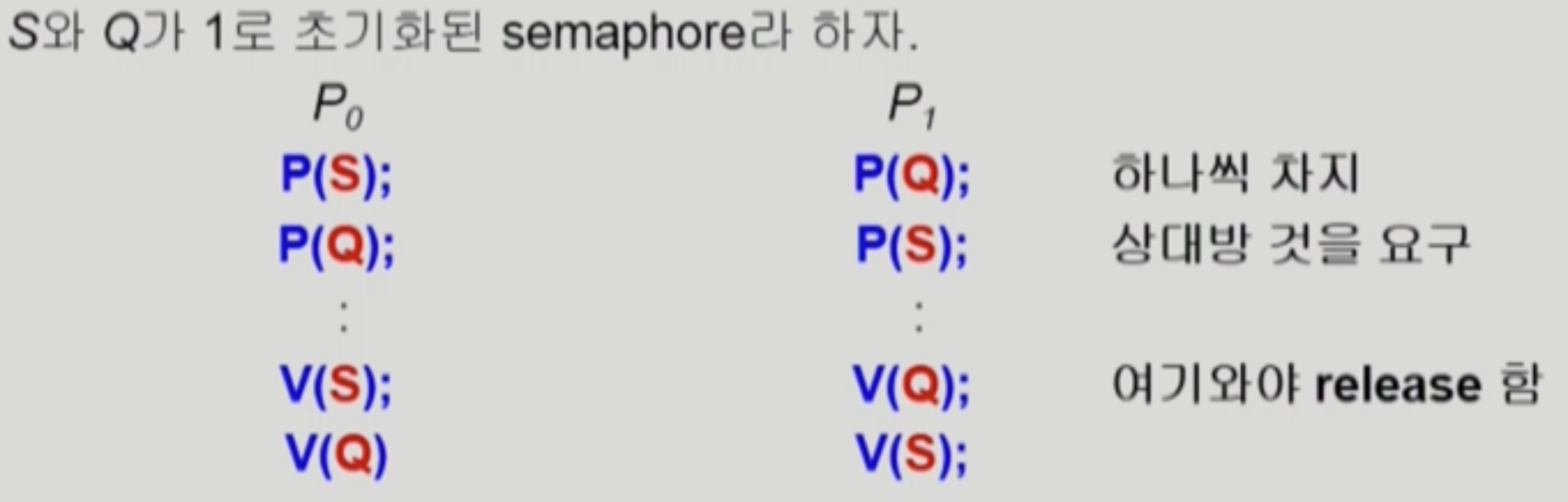 - P0 : 다시 0번 프로세스가 P(Q)를 수행하려해도 1번 프로세스가 Q를 갖고 있어서 대기하게 된다.