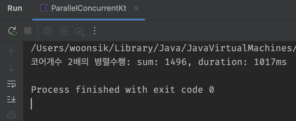 println("코어개수 2배의 병렬수행: sum: $sum, duration: ${end - start}ms")