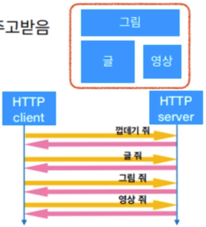 HTTP는 기본적으로 client가 server에게 Hypertext의 구성요소를 하나씩 요청해서 받아가는 형태