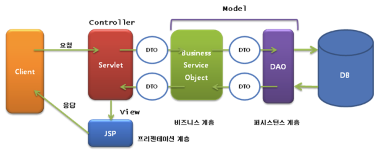 - Controller를 구체적으로 구현하지 않고, View와 Model로만 이뤄진 구조이다. JSP가 요청을 받으면 Model 영역을 선택해서 호출하는 구조로 View가 컨트롤러의 역활을 겸업하고 있다고 할 수 있다. 이 JSP가 클라이언트에게 보내줄 UI를 생성하므로 View 역활을 수행한다.