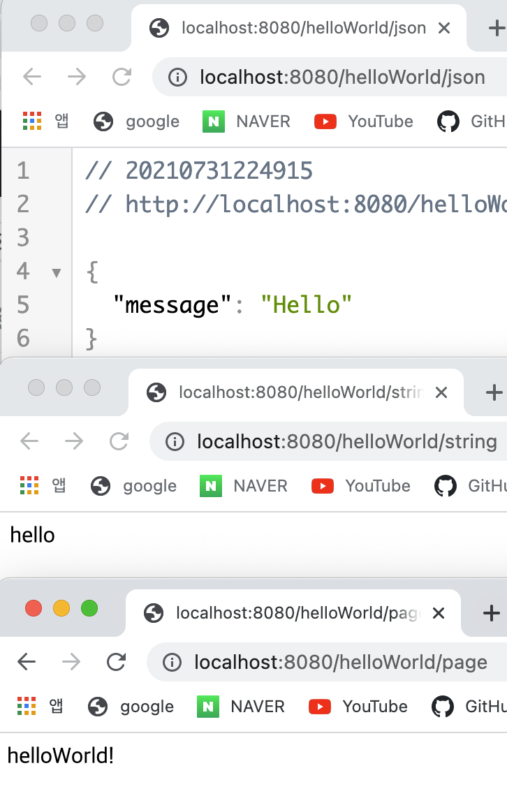 3가지 방법을 사용해서 브라우저에 hello, hello world를 출력해보았다.